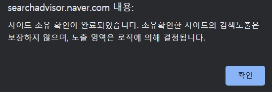 4. 메타태그 등록시 신경써야 할 점은 복사한 내용을 그대로 붙여넣기할 수 없다는 점입니다. 복사한 내용은 <meta name="naver-site-verification" content="315731..." /> 의 형식이실텐데 (content 부분의 값은 사이트마다 다른 것이 정상입니다.) 이를 1번 '메타 태그 추가'를 누르면 나오는 입력창에 쪼개서 넣어주셔야 합니다. 2번 name 부분은 기본 설정이니 그대로 두시고, 3번에 빨갛게 표시한 값을 넣으시고, 4번에 파랗게 표시한 값을 넣고 적용을 눌러주시면 됩니다. 블로그 설정에서 이를 완료 하신 후에는 다시 소유 확인 페이지로 돌아가서 위에 보여드린 이미지에서 처럼 HTML 태그 부분을 선택하고 소유 확인을 누르시면 됩니다. 문제가 없을 경우 아래와 같은 팝업창이 뜨며 소유 확인이 완료되고, 확인을 누르시면 사이트 등록이 성공적으로 이루어집니다.