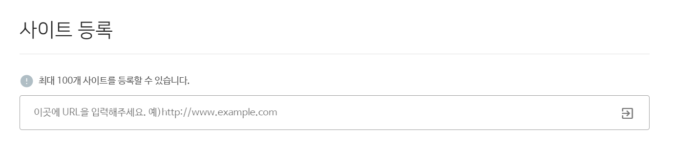 2. 그러면 위와 같은 사이트 등록 화면이 나옵니다. 입력창에 블로그 URL을 입력하시고, 엔터를 누르시거나 입력창 좌측의 화살표를 클릭해주세요. 그러면 아래와 같은 소유확인 화면으로 이동됩니다.